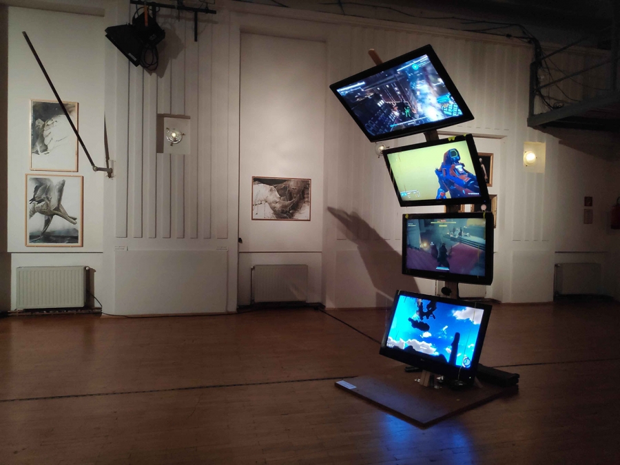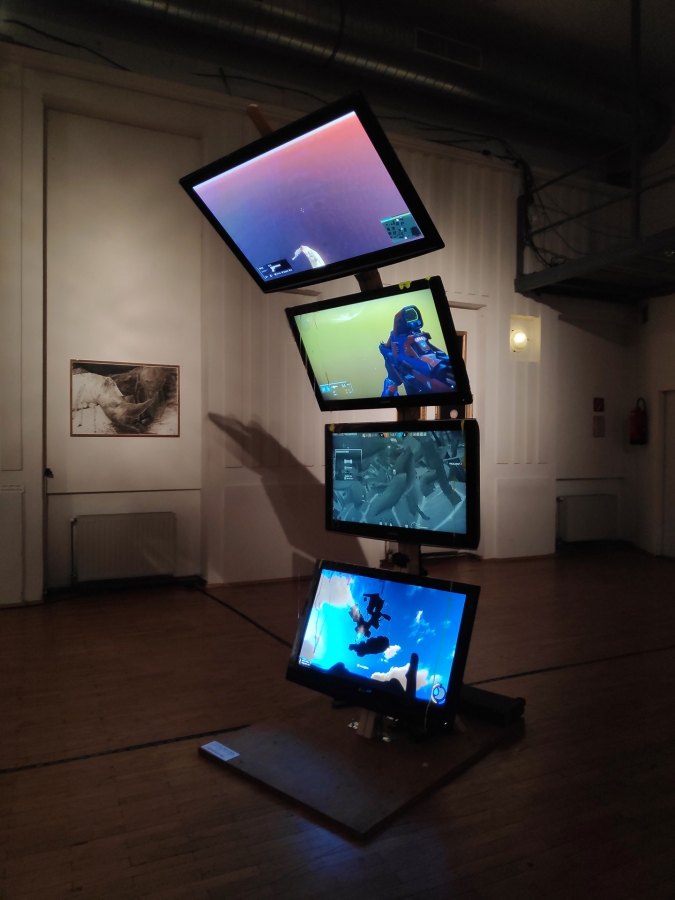 The video installation "Featherfall" is based on research in online forums in which video players* exchange their dream experiences. It becomes clear how close dream and game worlds can come to each other in the psyche of the users* and what feedback can develop between the two alternative realities. "Featherfall" ties in with the archetypal nightmare of "falling down", which often occurs during puberty. Falling without ever landing" exists in video games in the form of a recurring programming error - a glitch - through which the avatar falls beneath the surface into the empty, non-programmed space. The glitch as a digital nightmare.