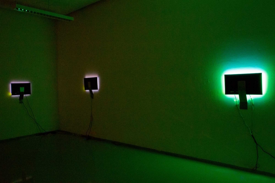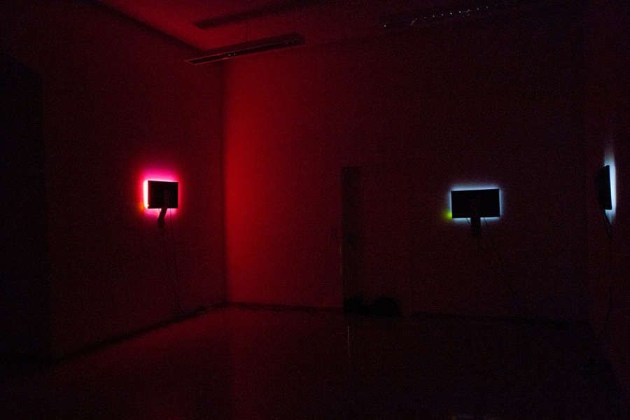 In the video installation JOY five screens are turned away from the spectator, with the screen against the wall. Screams and colored flicker are coming from the edges of the screens into the room. A score of cries is rotating, interfering or is falling out. The yelling was withdrawed from youtube videos (so called Let´s Play Videos), from people, who entertain themselves with horror.