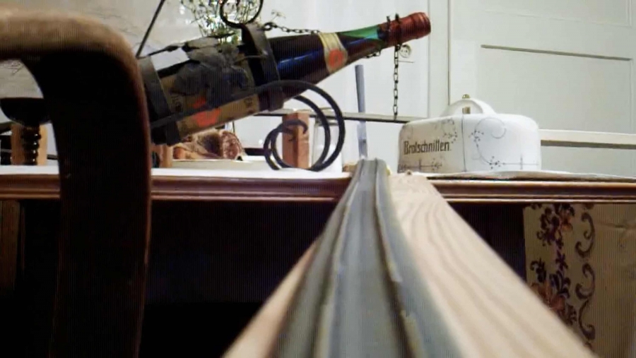 Die Möbel werden zersägt, das Gastmahl durchstoßen, der Lebensraum entrückt sich zu einem Spielplatz der Obsessionen. Gemeinsam mit Modelleisenbahnern wurde ein leerstehendes Gebäude eigens für das Projekt eingerichtet. Die Möbel wurden prepariert, sodass eine Modelleisenbahn den gesamten Wohnraum durchfahren kann. Gefilmt wurde mit einer Kamera für Modellhubschrauber, die auf einem Waggon angebracht wurde.