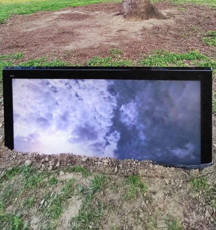 world merges with the simulation, marking the meeting point of the digital sky and the soil enclosing the screen.