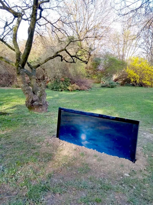 In Morgenerst – Abendletzt is a series of partially buried digital screens that display the journey of celestial bodies – sun, moon and stars – in their paths across the sky from sunrise to sunset. In addition to that, a series of descriptions of people moving through landscapes can be heard. However, these images are not real, but digital renderings taken from the worlds of computer games. Likewise, the travelers are not wandering through physically real spaces, but through virtual territories that