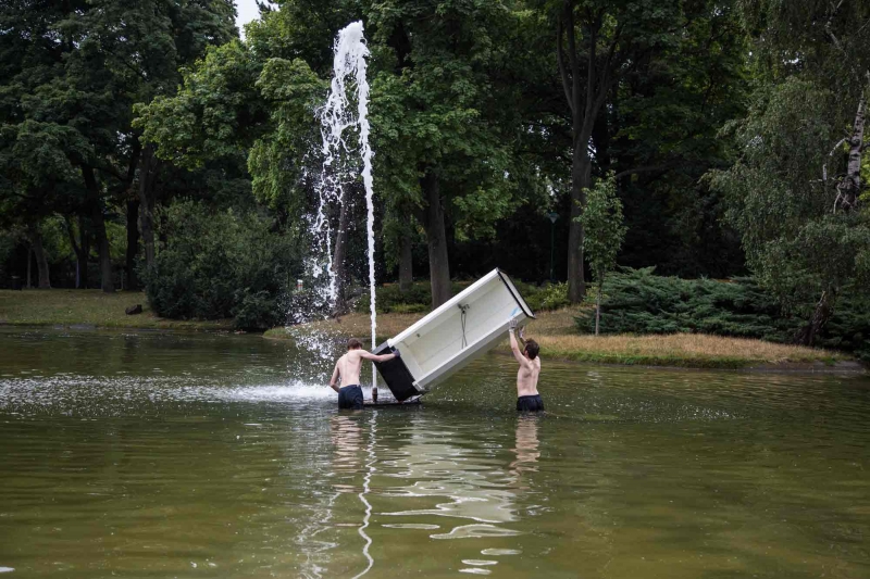 A shower cabin got separated from its familiar surroundings in order to get ennobled to become a fountain sculpture. The everyday object with its traces and its unglamorous presence is a sculptural understatement compared to other usual fountain objects. As Paramonument it redefines the possibilities to change the signs in public space.
