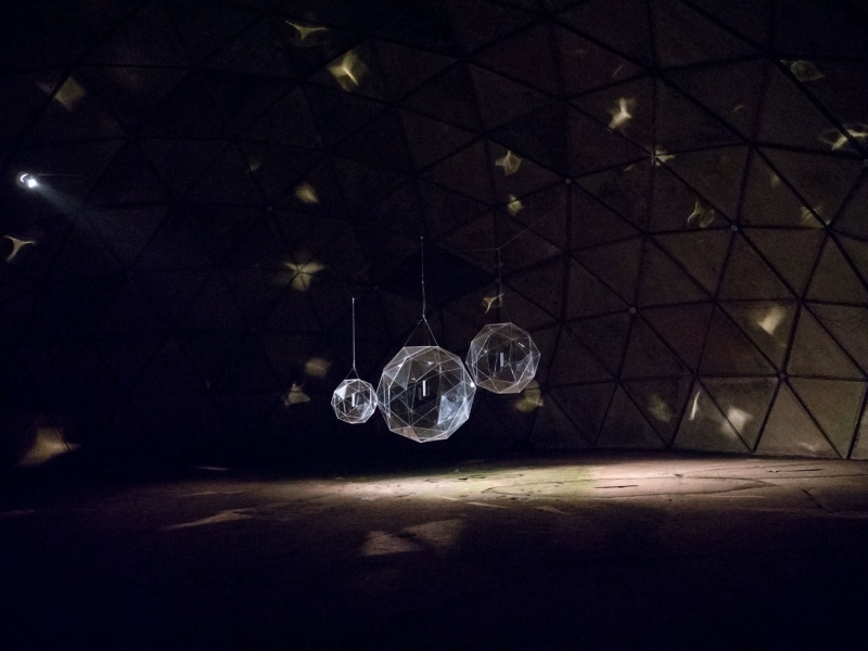 Geodesic spherical bodies vibrate to the tech sound of data centres. Like crystalline disco balls, they throw broken light against a wall, dancing and sparkling. Inside the polyhedron, the noise of data flows into the room. The whirring and whimpering in the center bleeds into the humming roar on the periphery.