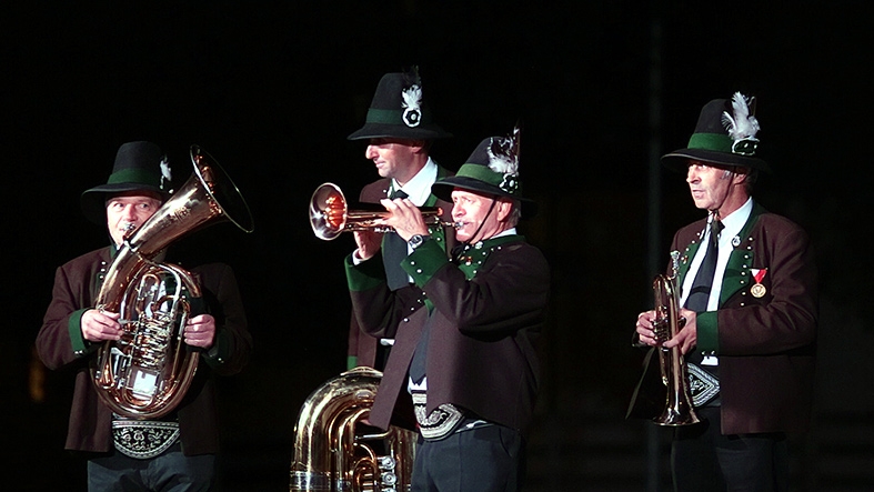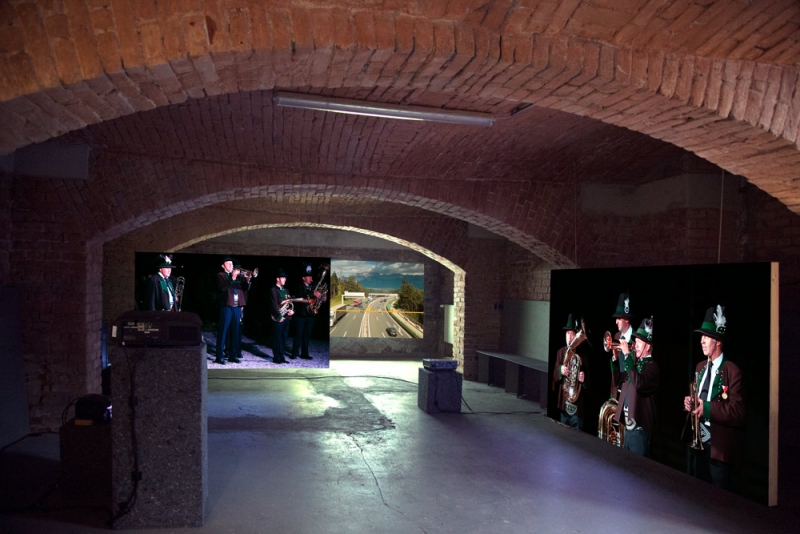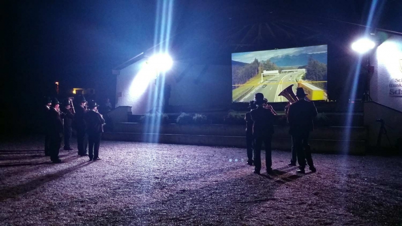 The project Schönberg op . A13- Transitlärm- Metamorphosen takes the bizzare traffic situation of the Tyrolean village Schönberg as a base to convert the transit noise into music. The highway, which surrounds the village is screened on a huge canvas and the local music band of Schönberg uses it as a sheet of music. The result is a aleatoric composion by the highway, which is interpreted by the instruments of a traditional brass band.