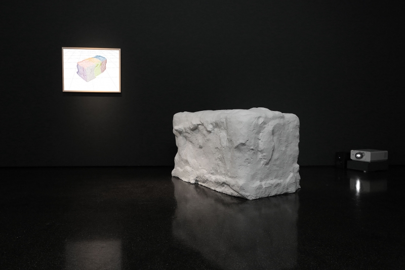 The video shows how a rough cuboid is being modeled out of a concrete block. This is done with the help of the limited tools offered by combat-focused game “The Division”. The sculpting process is being projected on the resulting shape, which was captured and printed out with the help of 3D-rendering software.